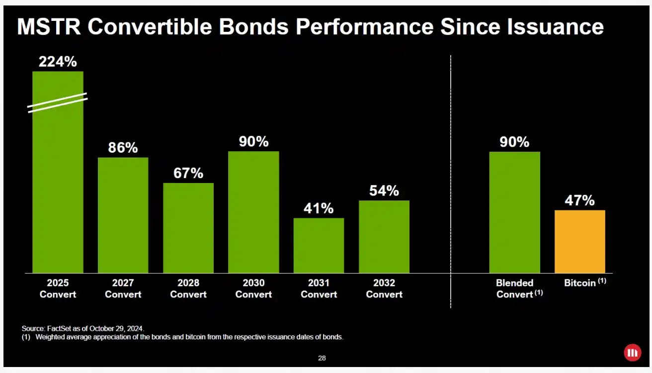 他的策略包括使用 ATM(At-the-Market)发行机制,在股价溢价时出售股票筹资,而这种溢价持续时间远超市场预期,通常比其持有的比特币账面价值高出 70% 至 100%。此外,他率先推动比特币的「金融化」,发行多次可转换债券,随着资产负债表扩张,他甚至拿到了极为优厚的债务条款,还发行过优先股。