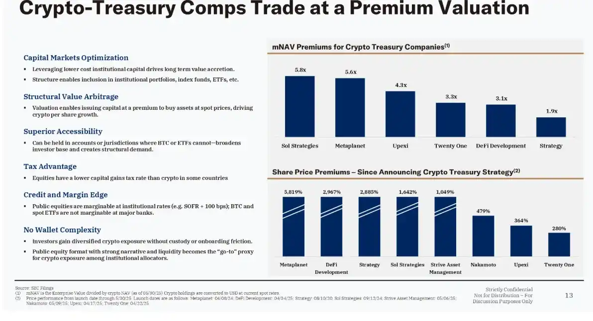 当时,大家的核心逻辑是:你投资的是一条「管道」,或者说是一家以接近净值(NAV)发行的公司。如果市场溢价持续存在,那么在短时间内,你有机会获得一定甚至可观的回报,因为公开市场会给这些财库公司赋予溢价,从而带动整个飞轮效应。