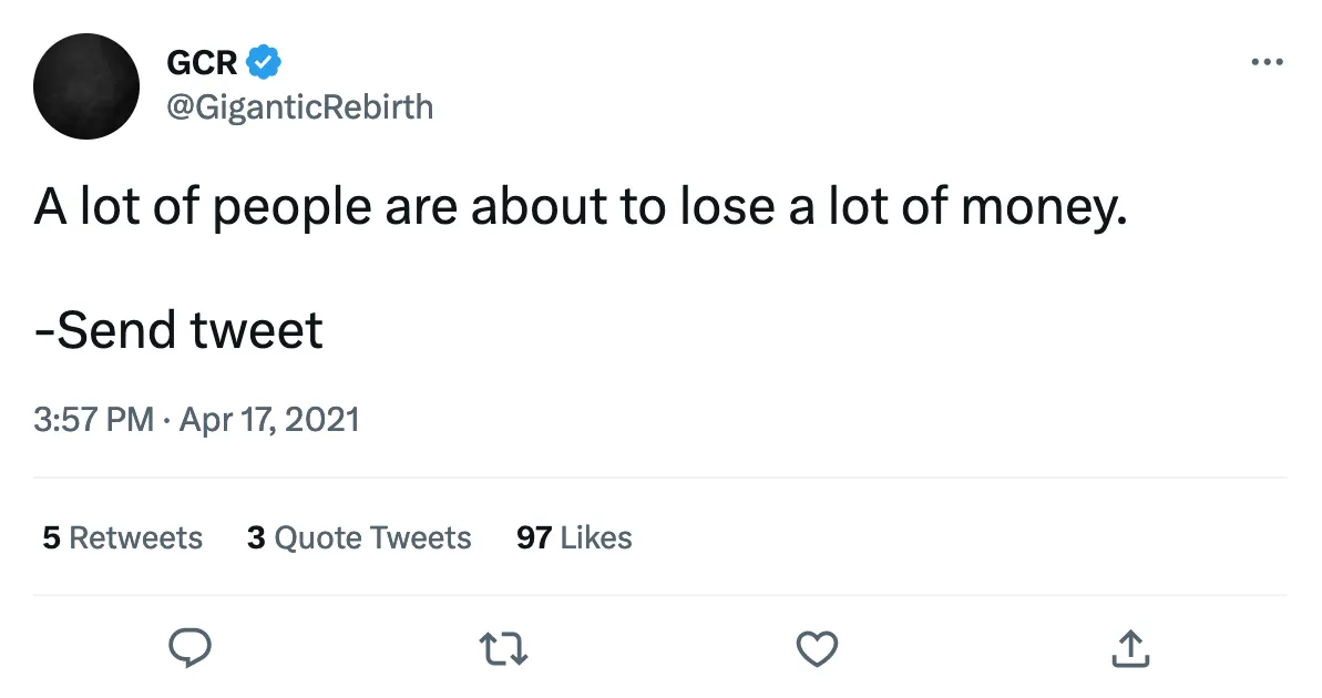 虽然我直到最近才开始发 Twitter(推特)内容,但我一直都在默默阅读。翻到最早的推文,我的目的很明确:我用 Twitter 来判断市场情绪,而不是用它来获取知识。信息是免费的,你应该自己去做研究,而不是依赖别人为你筛选信息。他可能错了,或者更糟,他可能带着某种目的故意误导你。