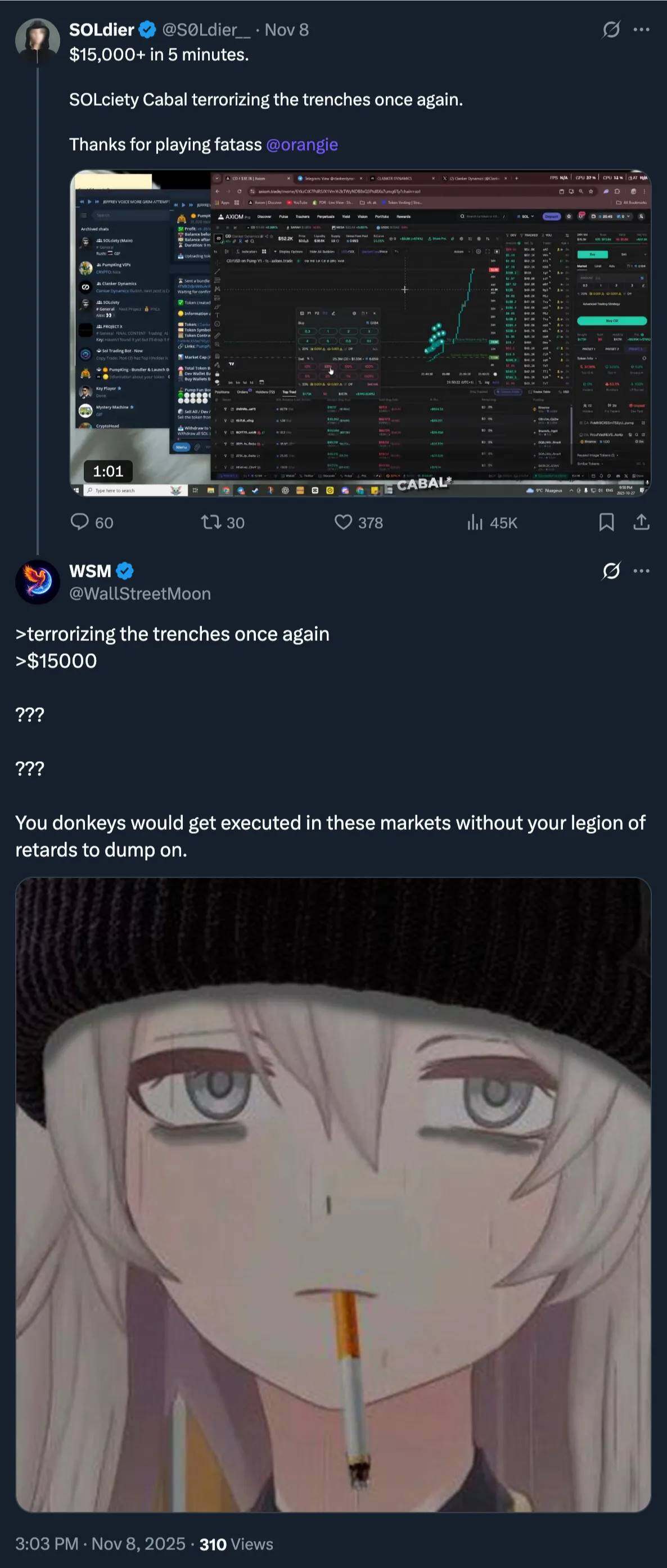 当那些实际操作“拉盘砸盘”(pumpanddump)的团体,或者像加密推特(CT)喜欢称呼的“秘密联盟”(cabals),开始积累我早已持有“神级仓位”(Godposition)的项目代币时,这场景真是颇具喜剧性。他们最终成了我的退出流动性(exitliquidity)。你无法惩罚一个早期进入者,因为他们的买入价格远远低于你的成本价。