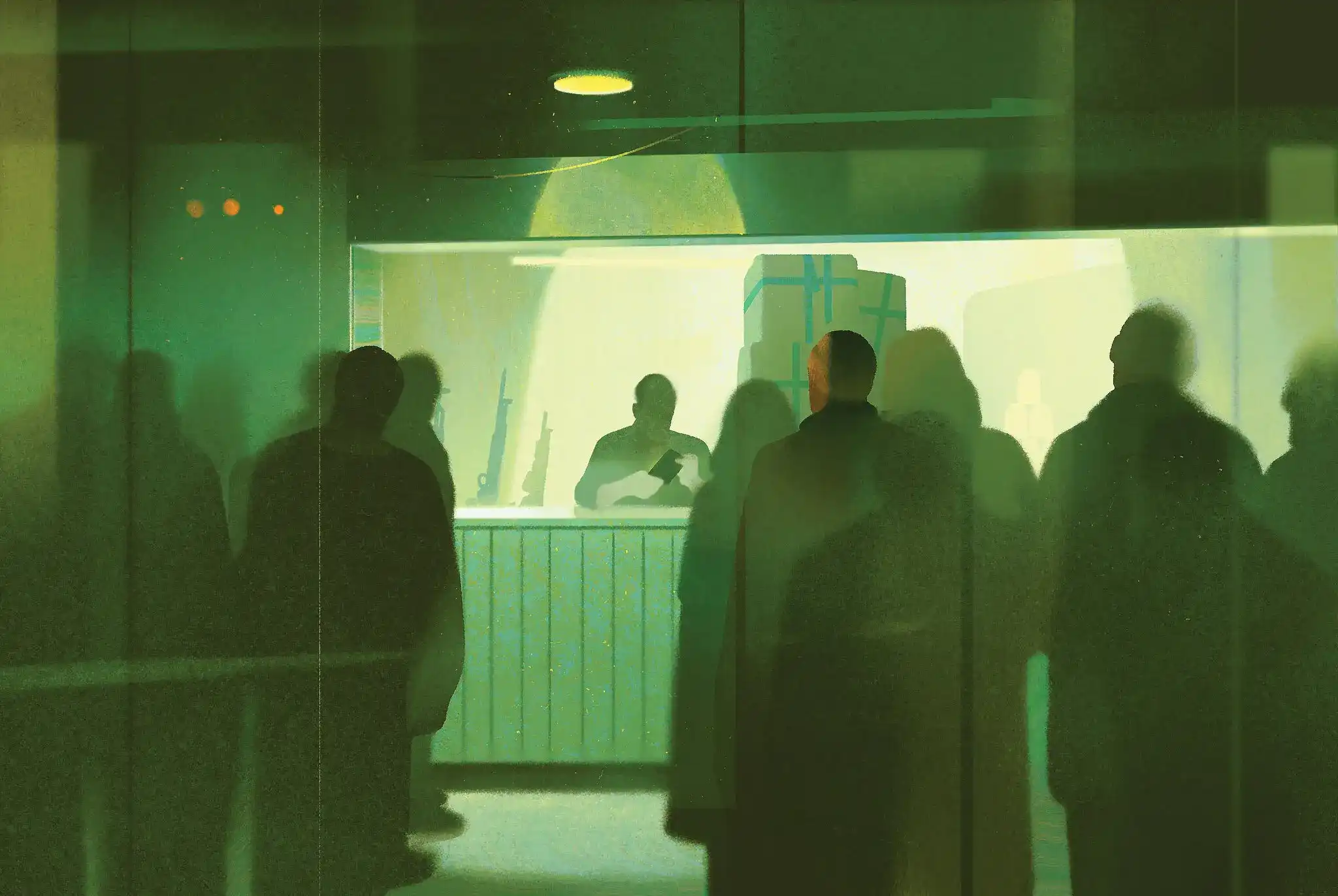 门后的小房间里是一家专门将加密货币兑换成现金的业务。桌上放着一台点钞机,旁边是一个老式塑料计算器和一个装满橡皮筋的纸箱,用于捆绑成捆的钞票。