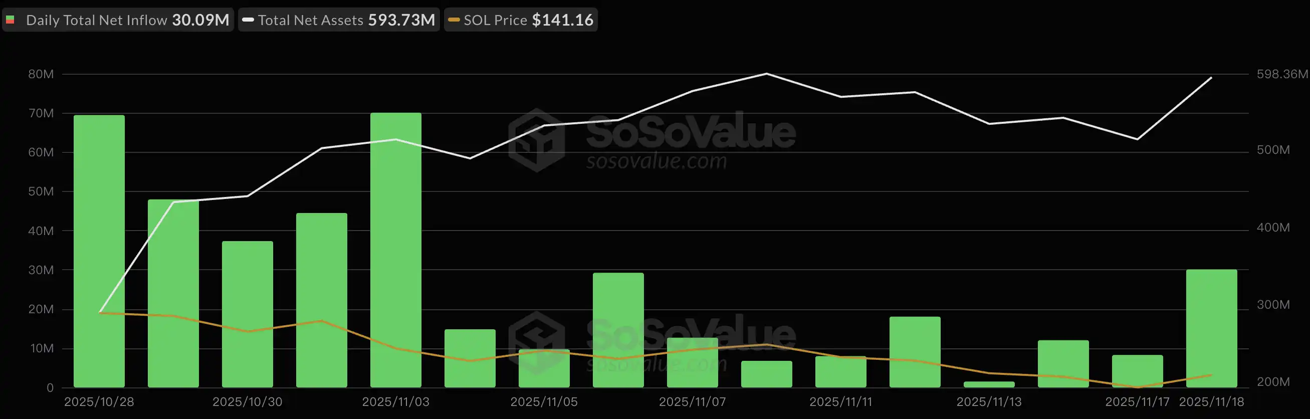 根据 SoSoValue 数据显示,截至 11 月 18 日,LTCC 累计净流入约 726 万美元。日度净流入普遍仅为数十万美元,且存在多日零流入的情况。