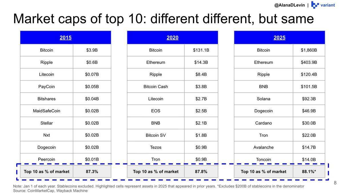 这一趋势在前五大加密资产中尤为明显——过去几年几乎没有新的资产进入这一梯队。