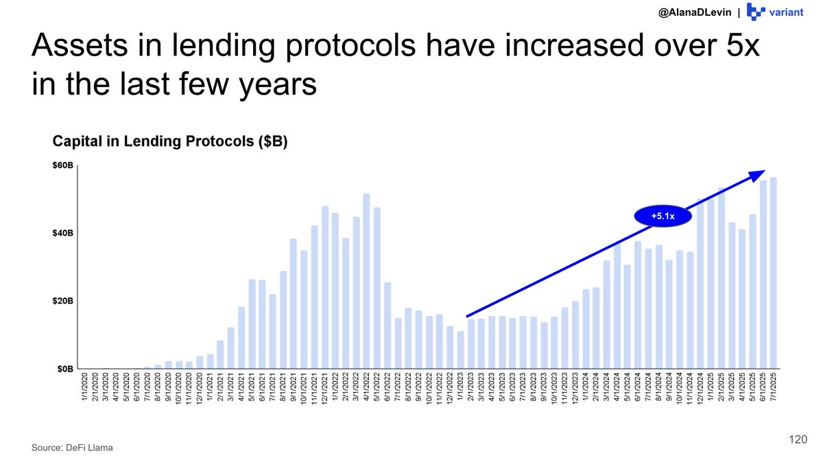 另一个可以观察到资产利用早期迹象的领域是链上借贷。借贷协议中的资产(如 @Morpho)在过去几年增长了 5 倍以上,并且仍在持续增长!