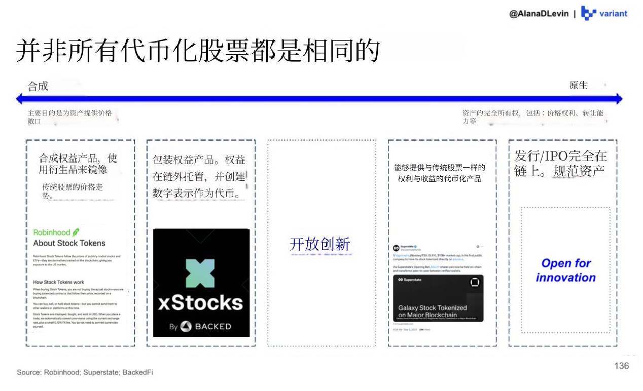 同样地,我们也开始看到链上股权的实验性探索。许多设计正在测试中,未来可能会形成一系列代币化股权产品的多样化光谱。