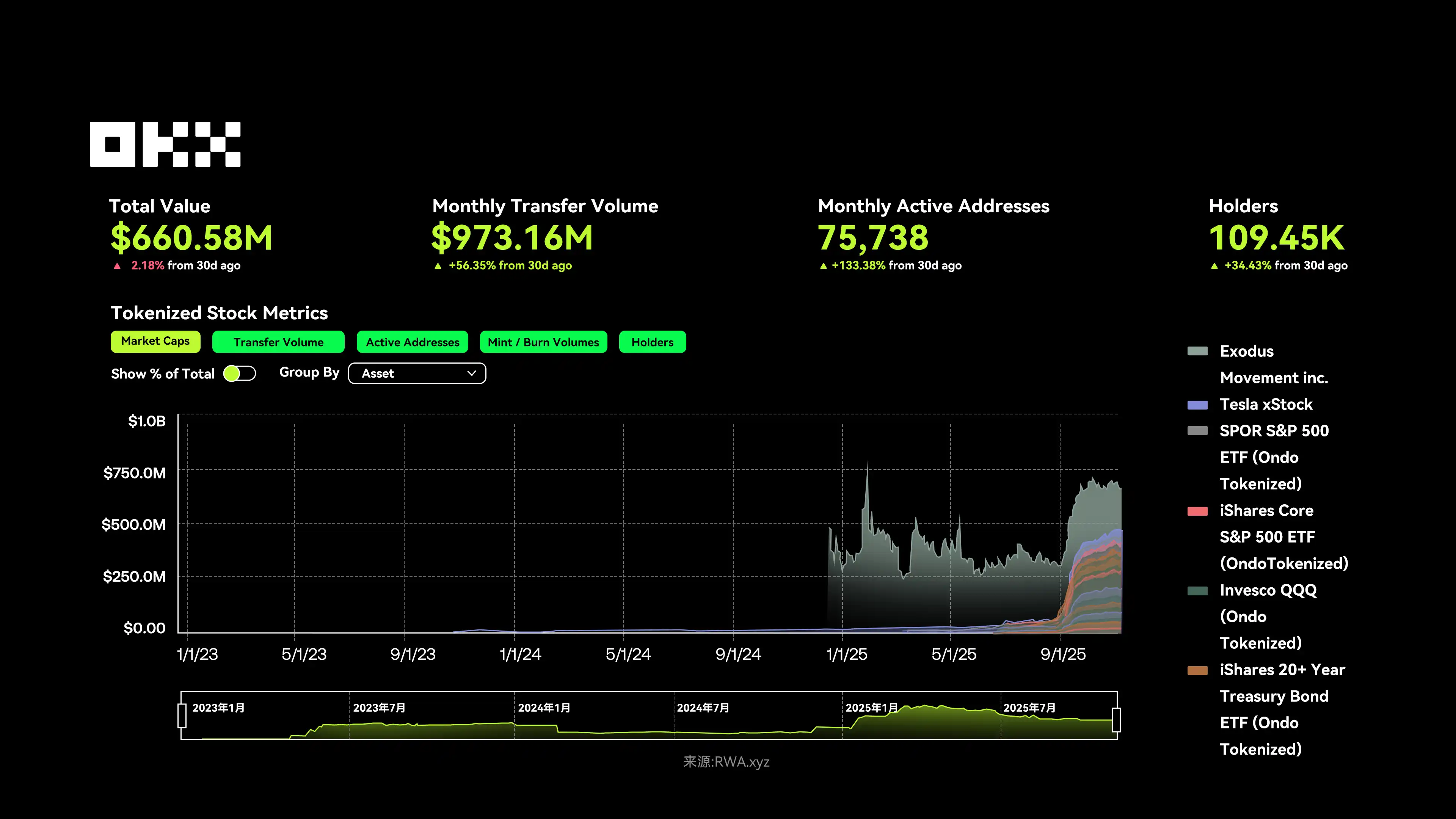 截至 2025 年 11 月 10 日,上市股票总锁仓价值为约为 6.61 亿美元、月交易额达 9.73 亿美元(环比 +56.35%),活跃地址 75,738(环比 +133.38%),持有者总数突破 10.9 万(环比 +34.43%),总体看用户参与度与交易热度正在持续回升,市场正在迎来一轮新的增长周期。