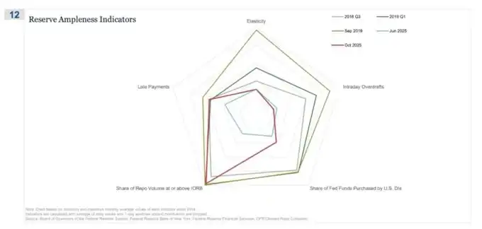 在这个雷达图上,「回购交易量达到或超过 IORB 的份额」是最清晰地表明我们正在悄然退出真正充足的储备制度的指标。