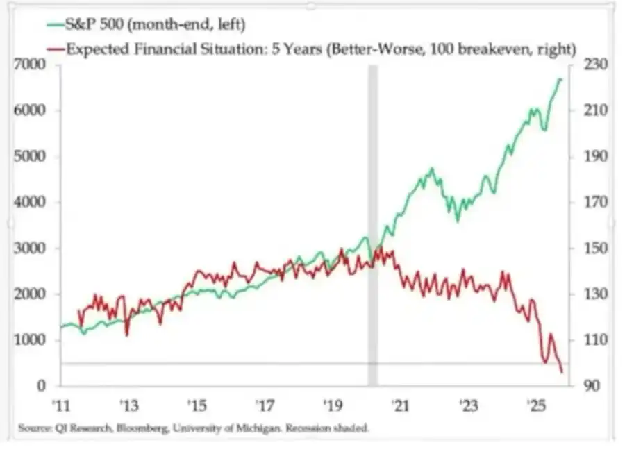 • 家庭预期呈现明显分化。较长期的财务前景(例如 5 年预期)差异显著:部分群体预期稳定甚至改善;另一些群体则预期明显恶化。