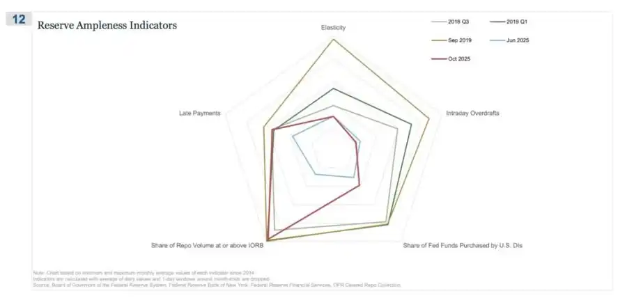 在这张蜘蛛图中,「顶到或超过 IORB 的回购成交占比」是最直观的信号,显示我们正在悄然离开真正的充裕储备状态。