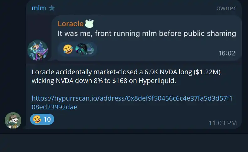 另一位巨鲸 Loracle 意外市价平仓了 1.2M 的 NVDA 多头头寸,导致价格瞬时下跌 8%。如果 trade.xyz 在未来提供高于 13 倍杠杆的选项,这种瞬间的流动性枯竭将导致无数交易者被清算。