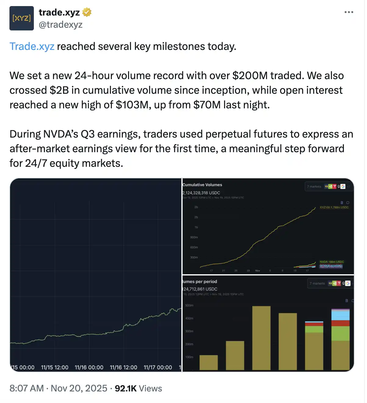 美股永续合约的 PMF 已经得到初步验证。数据显示,trade.xyz 的累计交易量已突破 20 亿美元,NVDA 财报发布期间更是创下了单日 2 亿美元的交易记录。