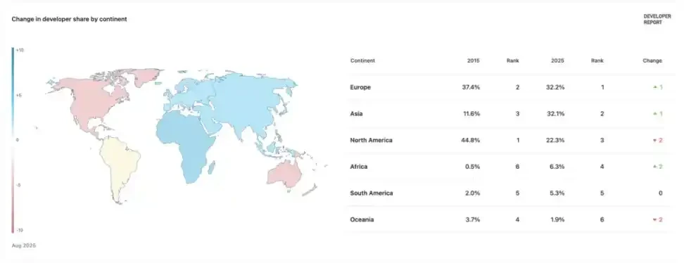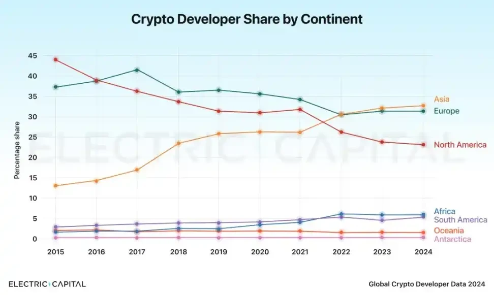 Electric Capital 2024 年开发者报告显⽰,亚洲地区的区块链开发者占⽐⾸次达到 32%,超越北美地区成为全球最⼤的开发者聚集地。