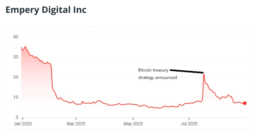 在此次调整之前,Empery Digital的股价大多在 6 美元至 7 美元之间,远低于 1 月份 35 美元的高点。7 月 17 日宣布比特币财库战略后一度将股价推高至 21 美元,但涨势并未持续,本周再次回落到7美元的正常区间。