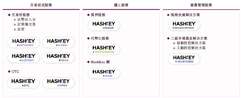 Hashkey Holdings旗下覆盖诸多业务,包括数字资产交易促成服务(HashKey Exchange等)、链上服务(HashKey Chain等)及资产管理服务。
