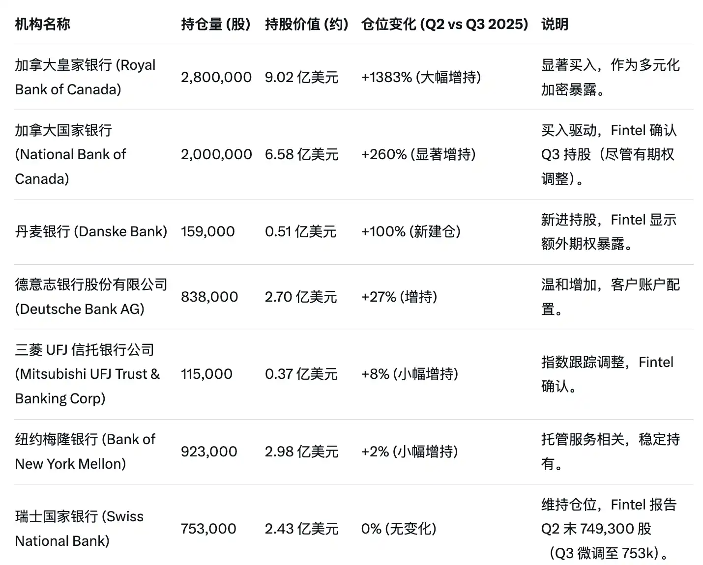 除了以上银行,部分央行在短暂持有 Strategy 股票后因市场波动或自身资产配置要求,不久后即清仓退出,如挪威中央银行年初时持有约 5 亿美元 MSTR 股份,后续曾不断增持,一度持有约 298 万股 MSTR,最终于今年 Q2 全部清仓,价值约 12 亿美元,浮亏约 2 亿美元;沙特央行(沙特阿拉伯货币管理局)也曾披露持有 2.56 万股 MSTR,间接持有 BTC 资产敞口,但目前或已清仓。