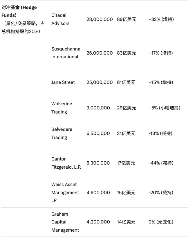 根据 Stockzoa 网站信息,截至 Q3 季度末(相较 Q2),持有 Strategy 股票的对冲基金信息如下(整理自 Grok):