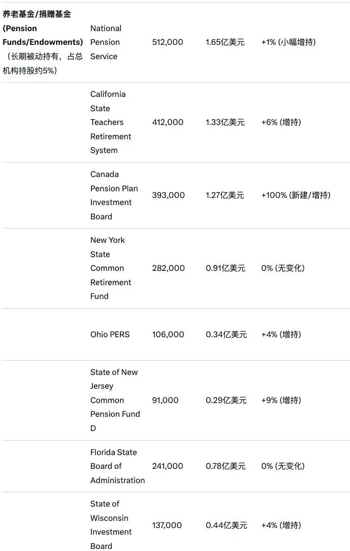 同样,根据 Stockzoa 网站信息,截至 Q3 季度末(相较 Q2),持有 Strategy 股票的养老基金及捐赠基金信息如下(整理自 Grok):