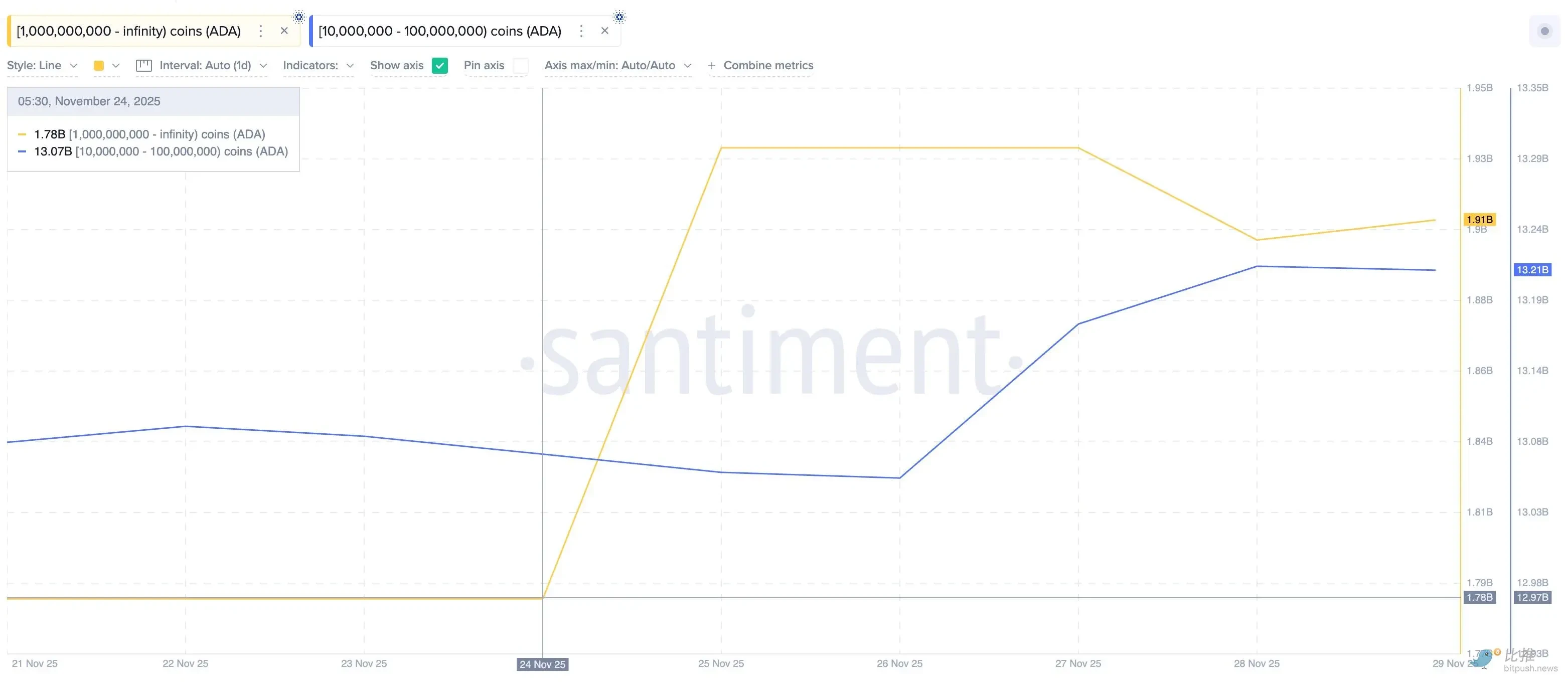 - 持有量在 1000 万至 1 亿枚之间的钱包则于 11 月 26 日开始增持,增持量为 1.5 亿枚 ADA;