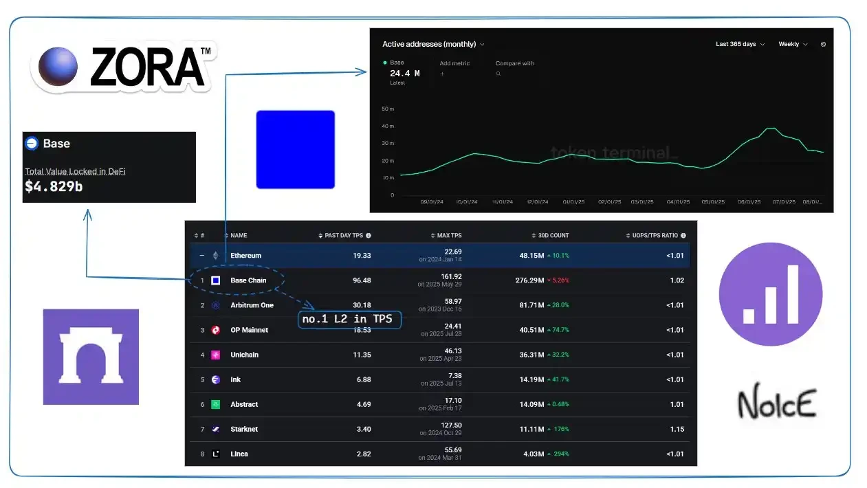 - Noice:一个 Farcaster Mini App,专注于打赏与互动,是 Farcaster 经济的流量入口。它通过内容打赏提升用户参与度,形成对 Zora 的代币化功能与 Farcaster 的社交层的补充。Noice 的影响力曾在 Base TBA 大会上由其创始人出席而得到凸显。
