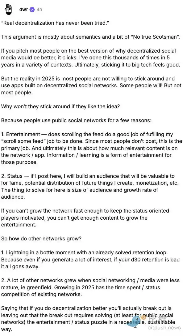 这并非傲慢,而是创业项目在生命周期后期常见的现实决断。从这个意义上说,Farcaster 不是放弃了社交理想,而是放弃了对其规模化的幻想。