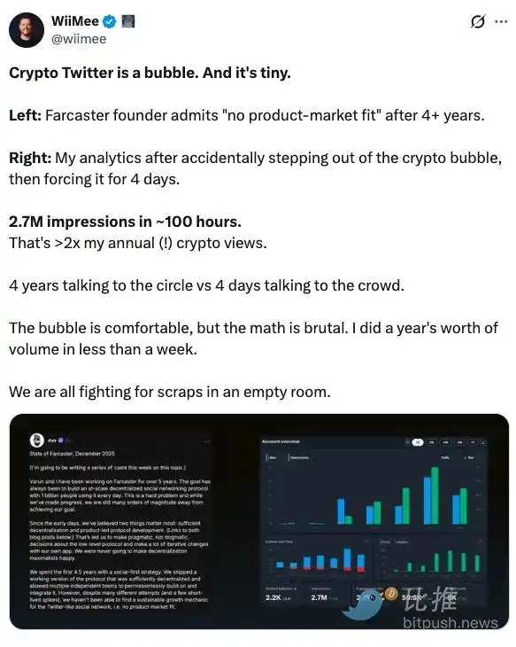 在一次「意外跳出加密内容圈层」后,Wiimee 连续四天面向泛人群创作内容,其分析数据显示,在约 100 小时内获得了 270 万次曝光,超过他一年内全部加密内容浏览量的两倍。