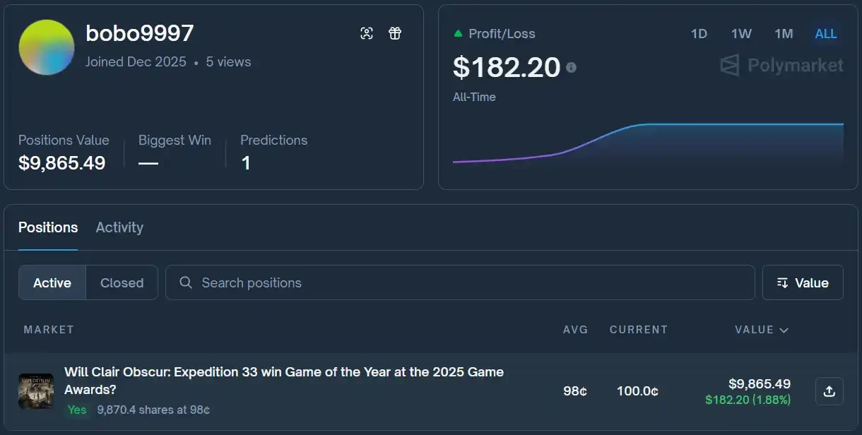 正当大家忧心忡忡之时,一个神秘人士在一个看似和游戏圈毫无瓜葛的「预测市场」平台注册了账户,并充值了一万美元。他找到平台里「光与影是否会获得 2025 年 GOTY」的话题,并将刚刚充值的一万美元全部押注在「是」。