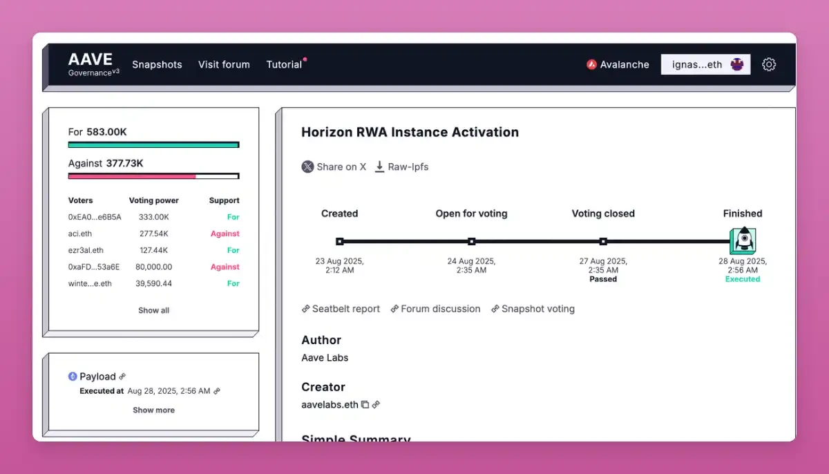 尽管存在诸多担忧(其中一项明确指出 Aave Labs 与 DAO 的明确职责),Horizon 仍上线了。这是最具争议的一次投票获胜。