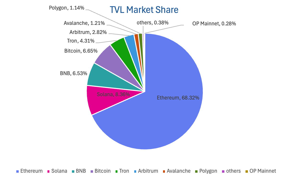 按公链进行划分,其中 TVL 最高的三条公链分别是 Ethereum 链,占比 68.32%;Solana 链,占比 8.36%;BNB Chain,占比 6.53%。