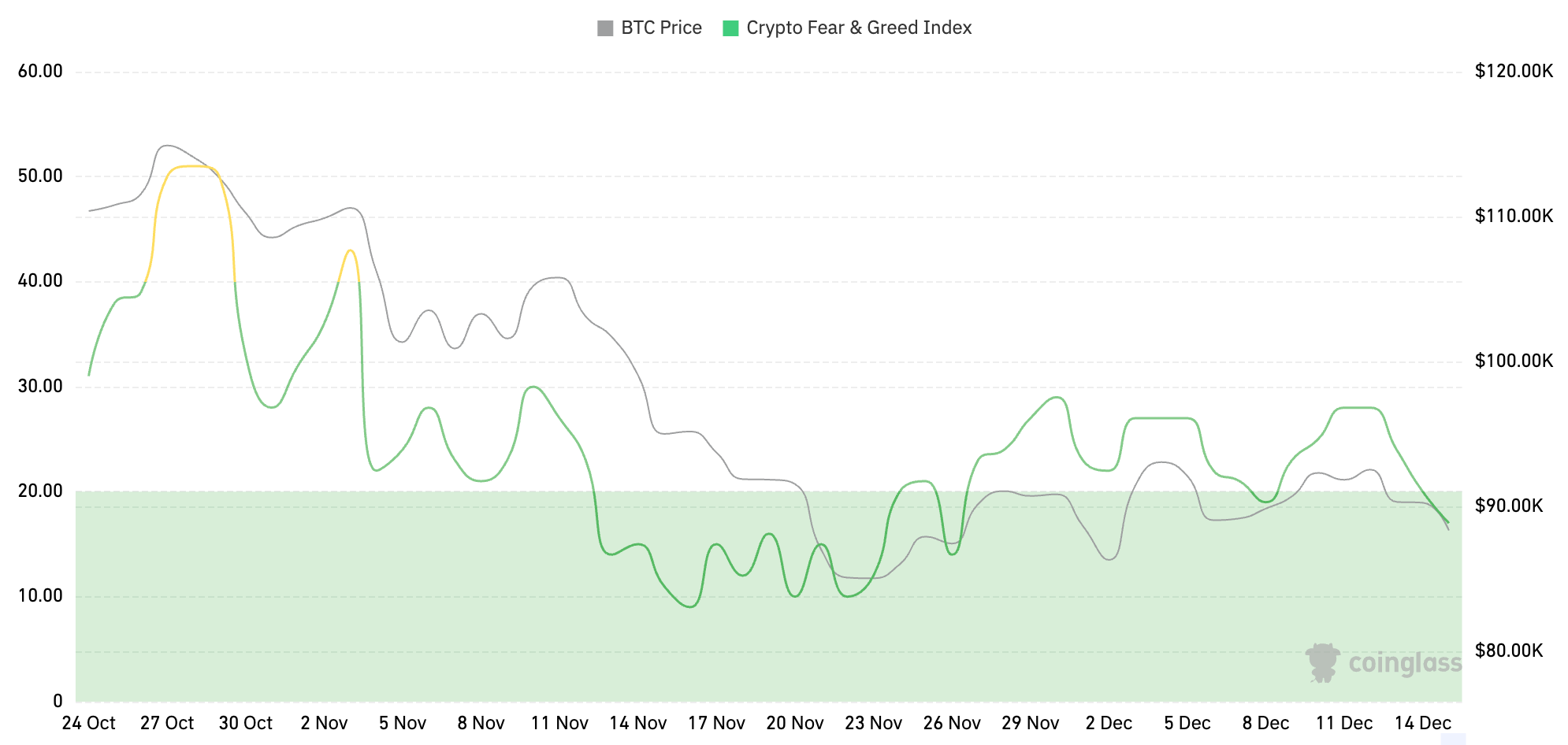 加密货币恐慌指数为 17,显示为极度恐慌。
