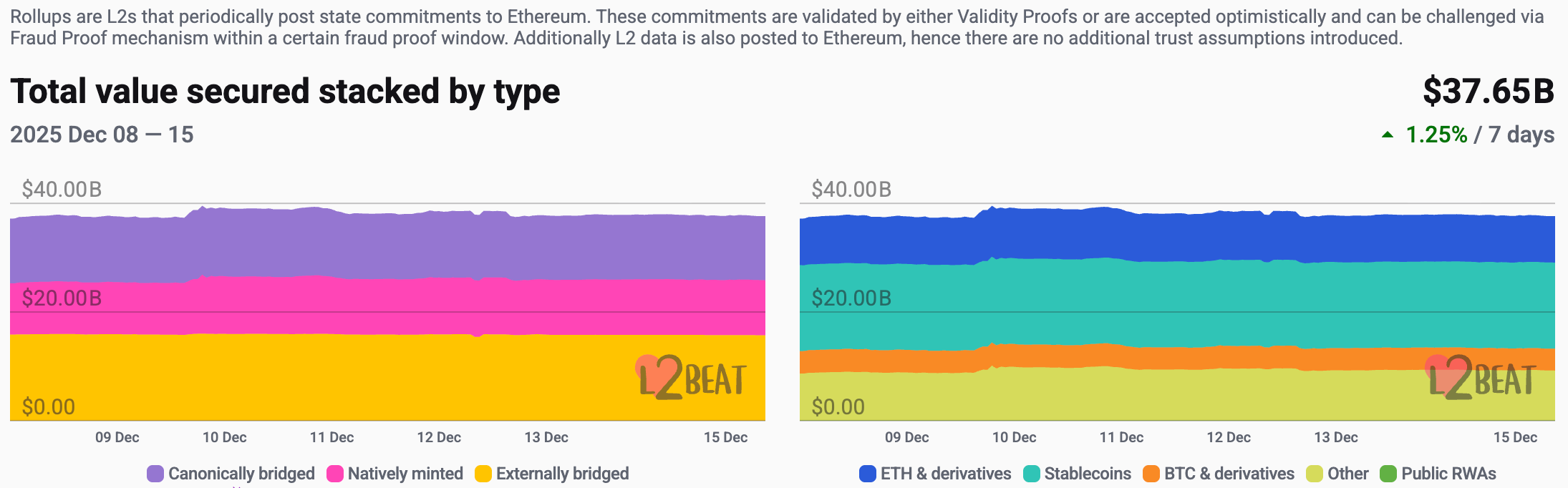 据 L2Beat 数据显示,以太坊 Layer 2 总 TVL 为 376.5 亿美元,本周较上周($371.7 亿)整体涨幅为 1.4%。