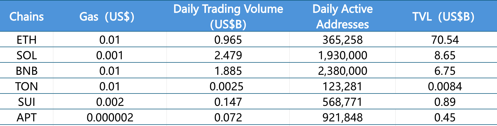 主要从日交易量、日活跃地址、交易费用分析目前主要 Layer1 含 ETH、SOL、BNB、TON、SUI 以及 APTOS 的相关数据。