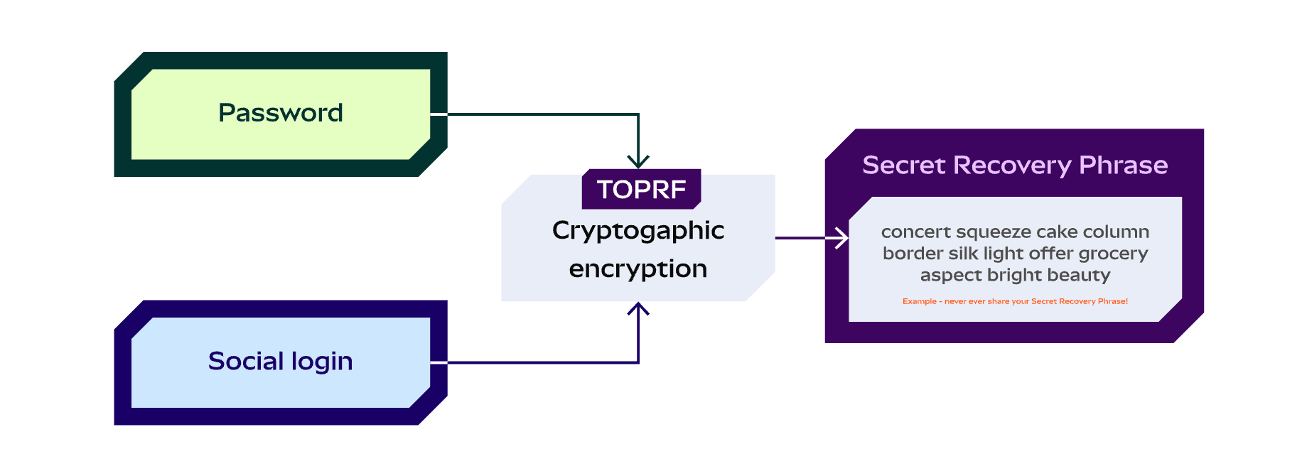 然后这个TOPRF 通过典型SSS(Shamir Secret Sharing,秘密分享算法),分片分发出去。而这些社交登录的服务商则会通过社交验证得到加密数据,还要结合用户的密码才能完全解密。