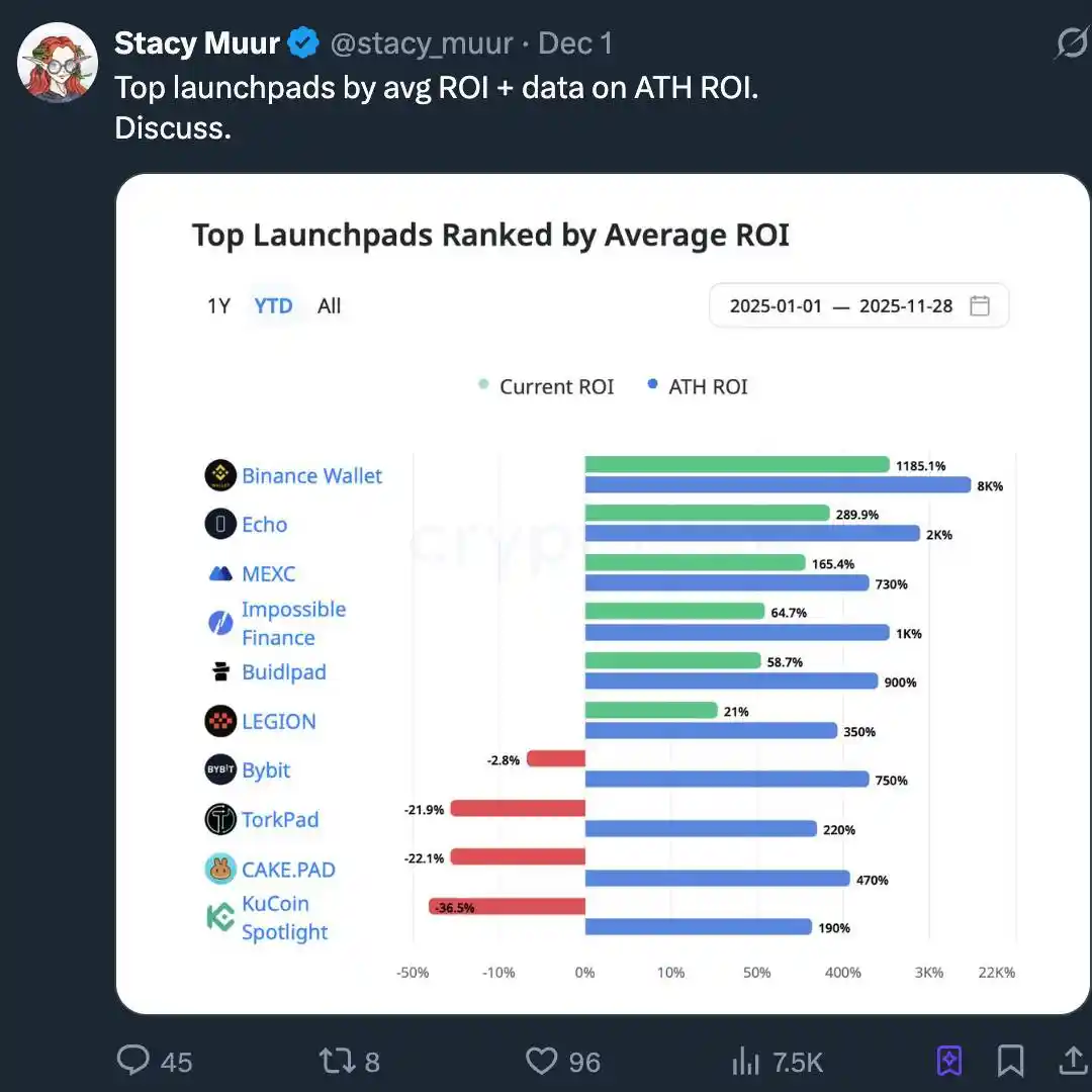 与此同时,我们注意到启动平台正在向交易平台整合,这是结构性转变的一个迹象:Coinbase、Binance、OKX 和 Kraken 相关平台提供了 KYC/AML(了解你的客户/反洗钱)合规、流动性保障,以及机构可接触的精心策划的发行管道。而独立的启动平台则被迫集中到垂直领域(如游戏、迷因以及早期基础设施)。