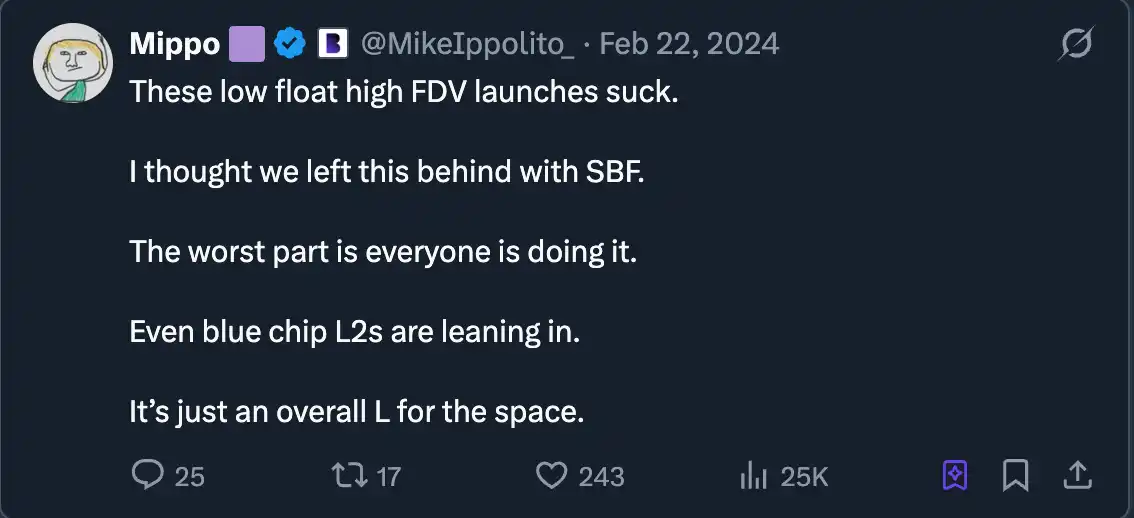 结果不出所料。这些代币在上线时价格飙升,但随着解锁期的到来和内部人士的退出,价格迅速下跌。Cobie 的名言——「拒绝购买虚高的 FDV(完全稀释估值)代币」——从一个网络梗变成了风险评估的框架。做市商拉大了买卖价差,散户干脆不再参与,许多此类代币的行情在接下来的一年中几乎没有任何起色。