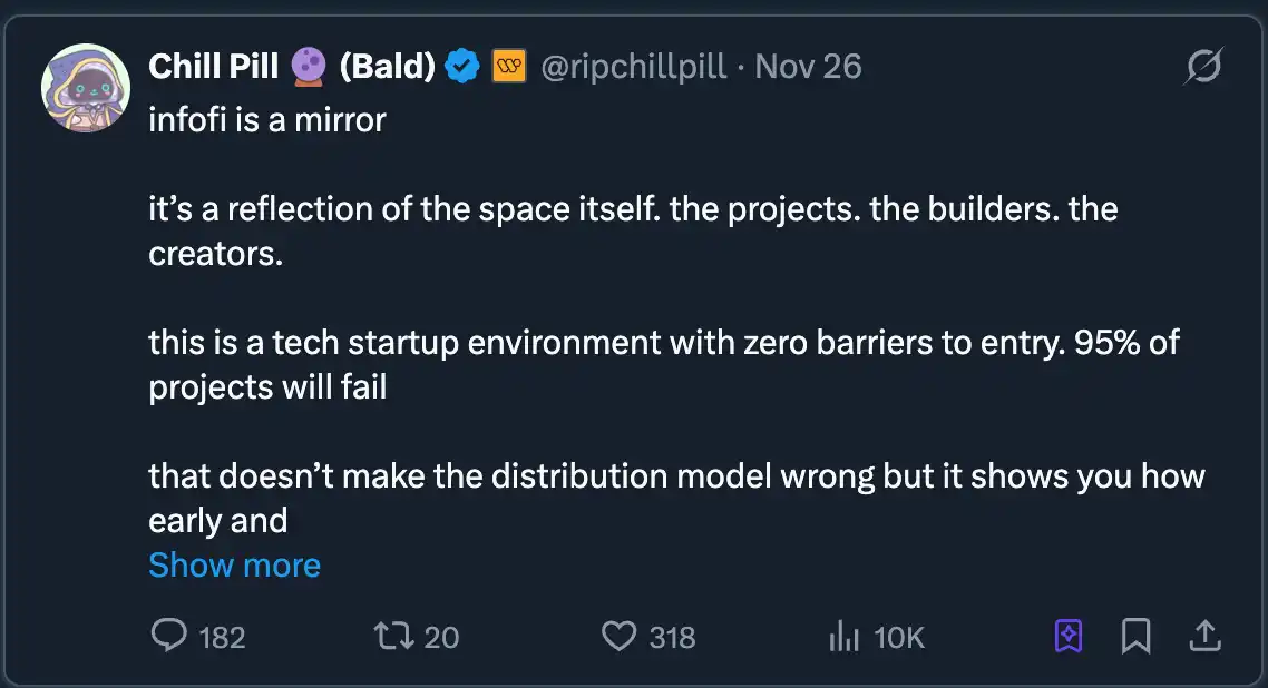 最终结论表明,InfoFi(信息金融)的第一代尝试在结构上是不稳定的。尽管核心理念——将有价值的加密信号货币化——依然具有吸引力,但激励机制需要重新设计,应以验证的贡献为定价基础,而非单纯依赖点击量。
