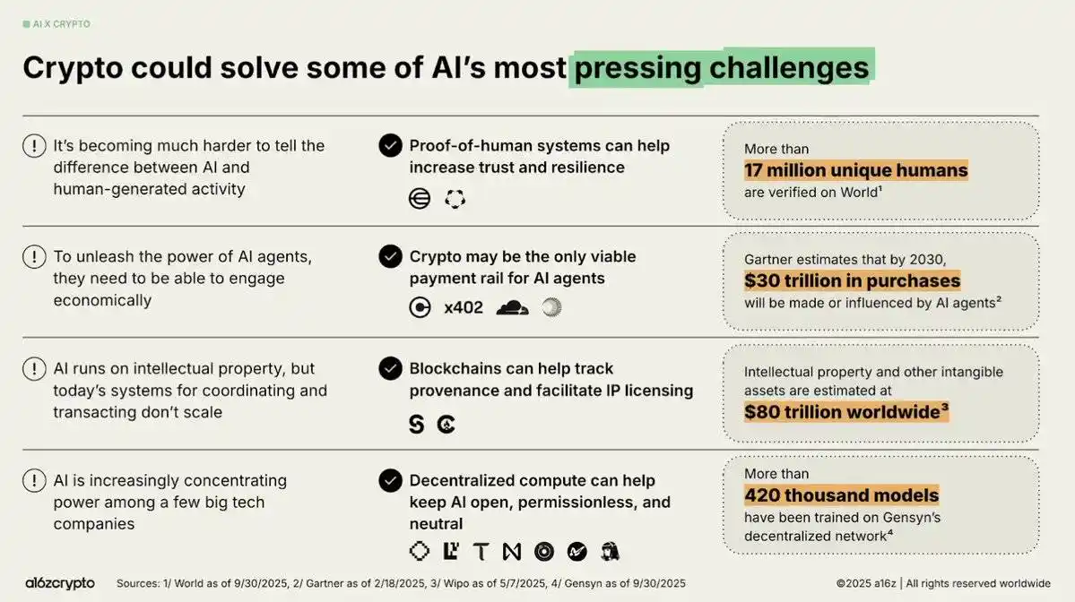 · 人工智能与加密(AI × Crypto)从炒作叙事转变为实际基础设施。