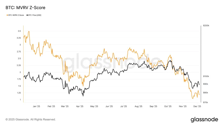 MVRV Z-Score 位于 1.17。它离开了便宜区域,但上行幅度有限。此处买家和卖家交织,增长放缓。趋势疲软且不明朗。