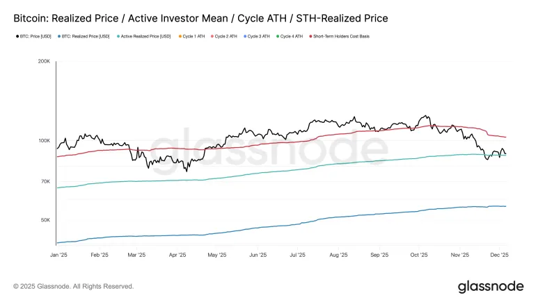 同时,关注短期持有者成本和活跃已实现价格之间的关系。如果短期线跌破活跃线,风险会迅速增加。目前,这种不利的交叉还没有发生。