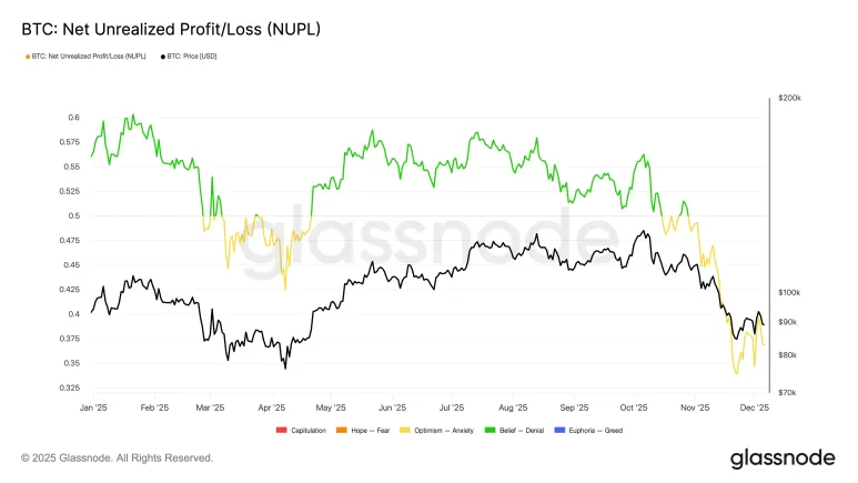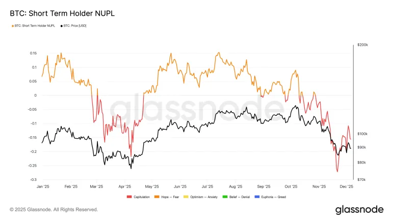 NUPL 为 0.36,刚好在公允区域内。短期持有者 NUPL 为-0.155。新买家处于亏损状态。一旦价格触及其成本,他们就会卖出。这证实了市场情绪的疲弱。