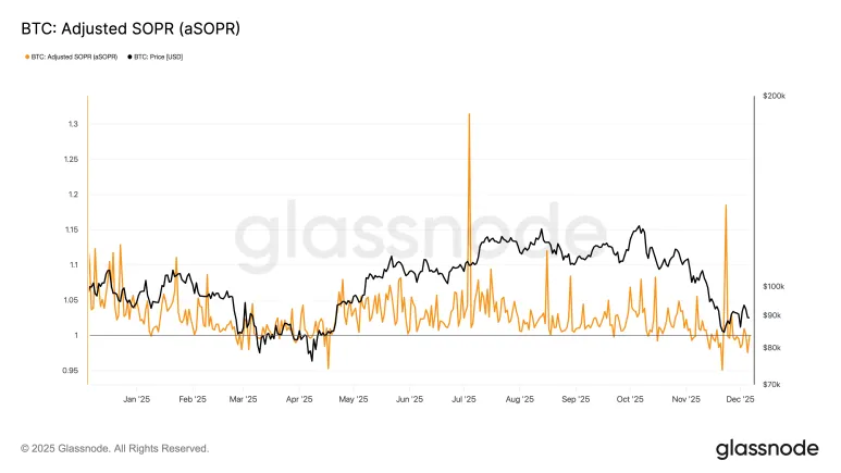 aSOPR 持平于 1.0。卖家正在成本价交易。他们即使获利微薄也会卖出。