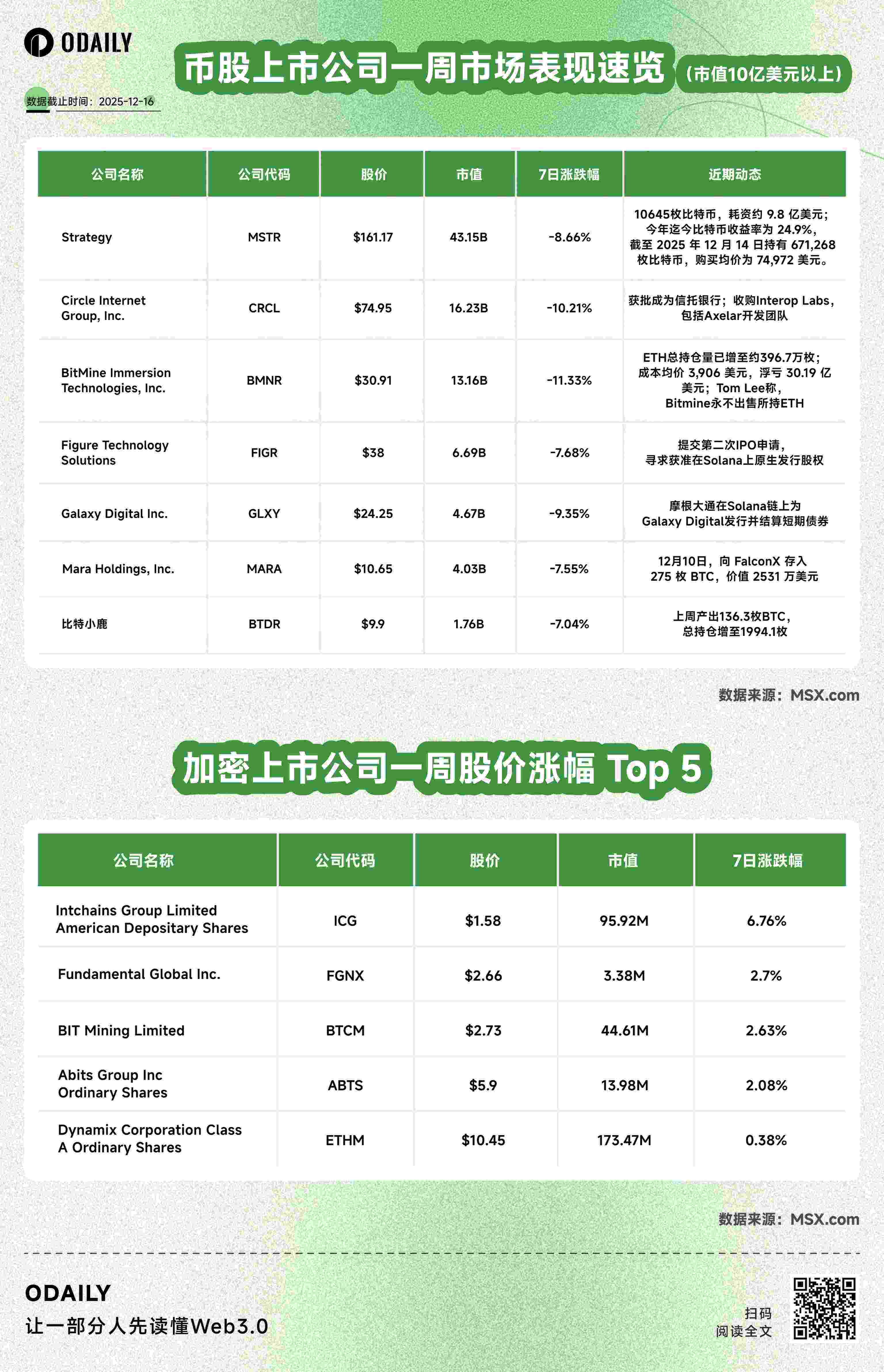 编者按:经历了美联储降息 25 个基点的“利好落地即利空”,加密货币概念股市场再次迎来规模性下跌。据 msx.com 网站数据,超 50 只相关个股中,仅 5 只个股近 7 日股价保持正向上涨,其余个股近 7 日跌幅最大超 30%。在美股市场迎来新高之际,包括 Strategy、Circle 在内的多只加密概念股再次迎来了自己的“至暗时刻”,考虑到后续特朗普提名美联储新任主席一事的复杂性,本年度的“圣诞节行情”恐变为“圣诞劫”。寒冬来临,建议参与币股交易的投资者近期谨慎出手。