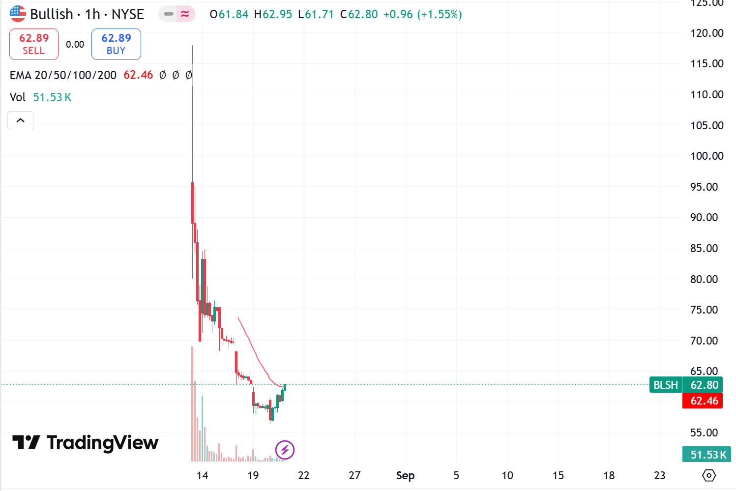 上市首日,Bullish 股价一度冲上 118 美元/股,涨幅超过 200%,多次因波动过大触发熔断。虽然热潮过后股价有所回落,截至目前报 62.89 美元,但仍较发行价上涨近 70%。