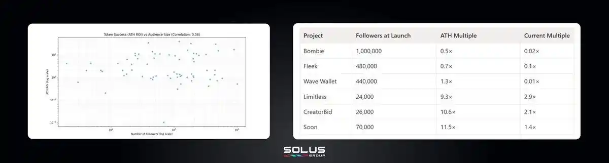 数据显示,受众粉丝规模对代币表现没有任何预测价值,拥有庞大粉丝群的项目表现参差不齐——有的暴涨,有的暴跌,受众规模小的项目也一样,没有趋势,没有规律,也没有相关性。