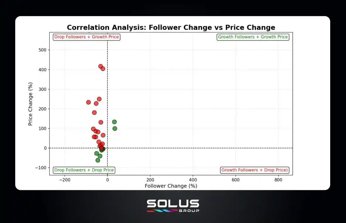 当价格暴跌时,追随者会消失。图表证明了这一点——左下象限(追随者减少+价格下跌)非常密集。当价格飙升时,追随者有时会随之增长,但并不稳定。