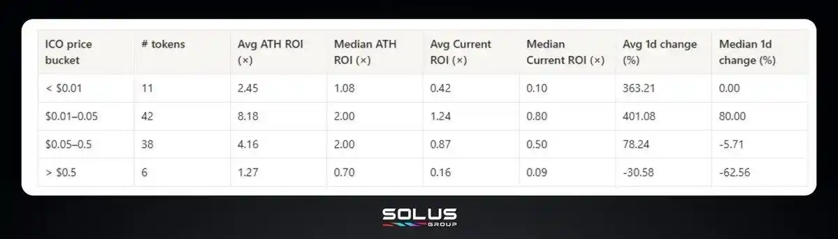 0.01 美元至 0.05 美元的代币价格区间是唯一具有生存能力的定价区间,这个价格既足够高,足以表明项目的合法性,又足够低,留有上涨空间。在这个价格区间内,97 个项目中只有 42 个项目代币的中位数表现为正。
