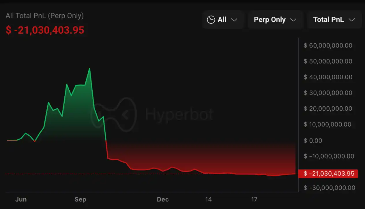 麻吉大哥仅在 11 月 1 日至 19 日这短短 19 天内,就被强制清算 71 次。这意味着在接近三周的时间里,他平均每天要经历近 4 次爆仓,荣登链上「清算冠军」宝座,但他一直在不断地充值、爆仓、再充值、再爆仓。截至撰文,他在 Hyperliquid 上的永续合约总亏损已达到 2120 万美元。从赚 4566 万到亏 2120 万,他在短短不到 3 个月的时间里,经历了超过 6600 万美元的资产回撤。尽管有过短暂回血,但他目前依然处于深度亏损和频繁补保均金的状态中。