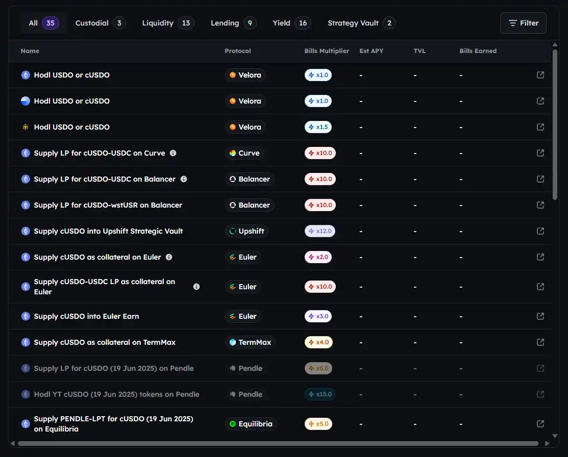 该项目获得了 Yzi Labs 的投资,$TBILL 的 TVL 目前已接近 3 亿美元。在 8 月 14 日,OpenEden 宣布推出原生代币 $EDEN,7.5% 的 $EDEN 将分配给「Bills」活动的参加者。通过一系列 $USDO 与 $cUSDO 相关的活动可获得 Bills 积分。