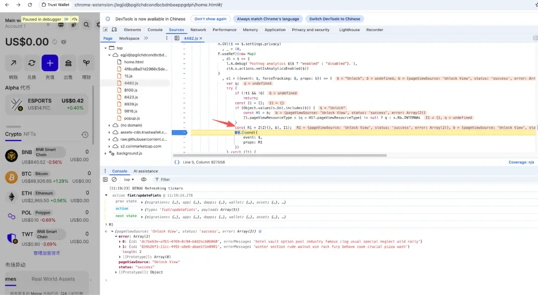 恶意代码会遍历插件中所有的钱包,并对用户的每个钱包发起一次 “获取助记词” 的请求获取到用户加密后的助记词,最后使用用户在解锁钱包时输入的 password 或 passkeyPassword 进行解密。如果解密成功将会把用户的助记词发送到攻击者的域名 `api.metrics-trustwallet[.]com`上。