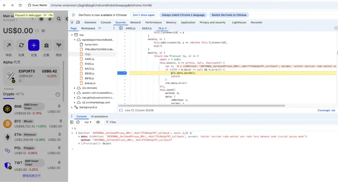 2. 立即导出私钥/助记词并卸载 Trust Wallet 扩展钱包。