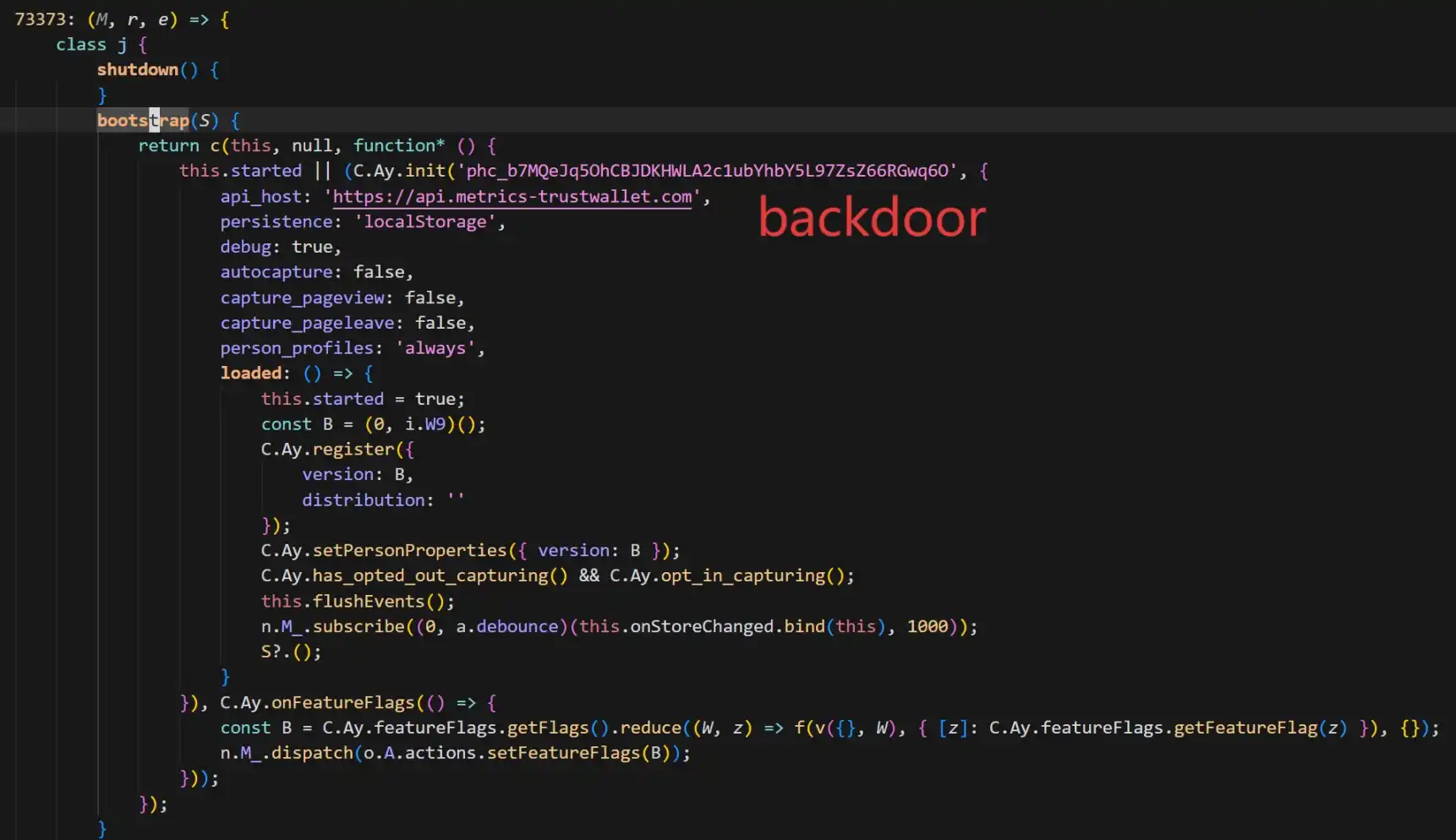 后门代码增加了个 PostHog 来采集钱包用户的各种隐私信息(包括助记词),并发送到攻击者服务器 api.metrics-trustwallet [.] com。